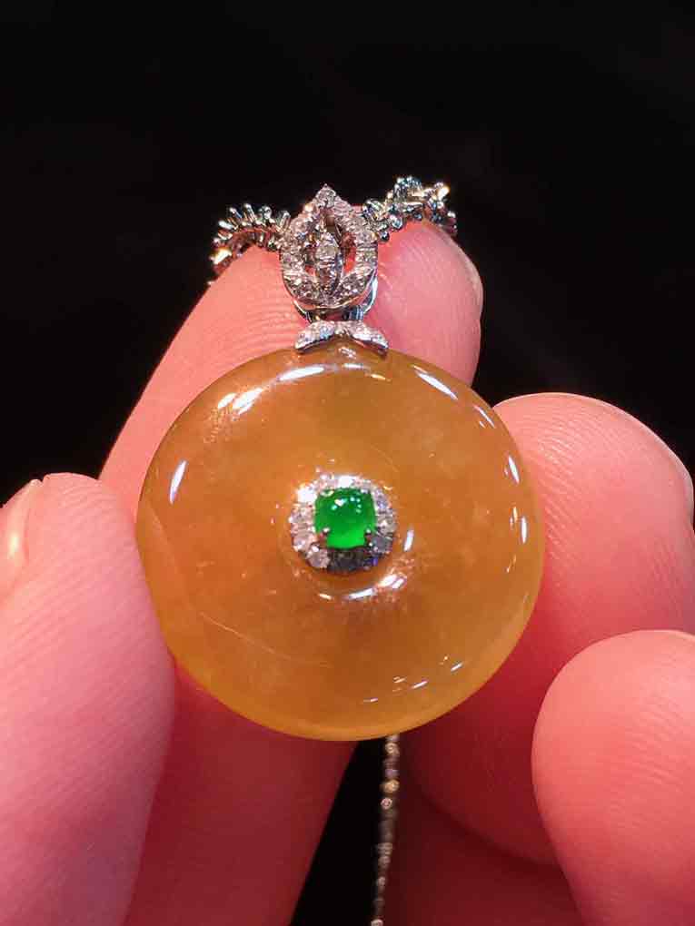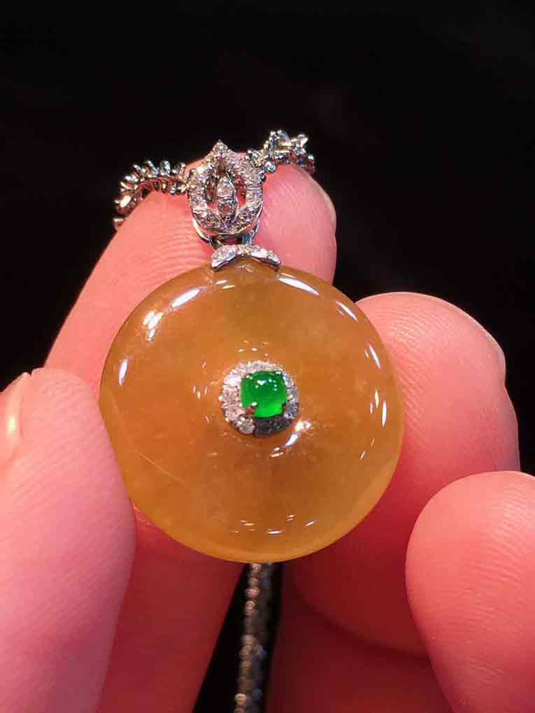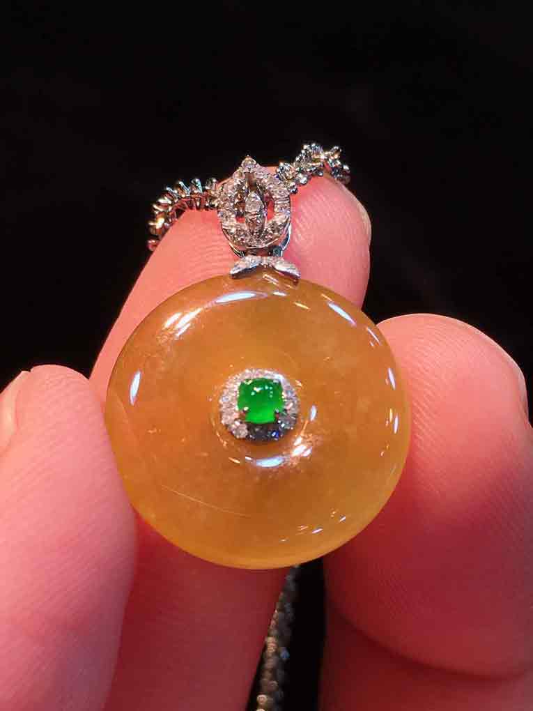 🍀冰种金翡平安扣吊坠,平平安安 冰透水润,底子细腻透亮,颜色浓艳。18K金伴钻豪华镶嵌